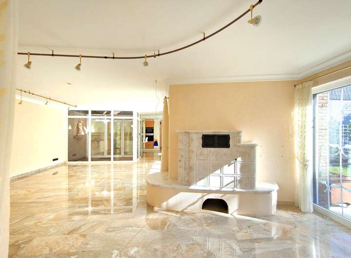 Im Erdgeschoss empfängt Sie ein großzügiges, helles Wohnzimmer mit bodentiefen Fensterfronten und großen Schiebetüren, die direkten Zugang zur Terrasse und zum Garten ermöglichen. Ein Kachelofen sorgt für behagliche Wärme und eine wohnliche Atmosphäre. Ein Glas-Lichthof trennt Wohn- und Essbereich und sorgt für lichtdurchflutete Räume. Die offene Küche mit integriertem Essplatz fügt sich harmonisch in das offene Raumkonzept ein. Ein Wintergarten mit Heiz-Kamin, der auch den Kachelofen mit heizt, ergänzt den Wohnbereich und bietet ganzjährig gemütliche Aufenthaltsqualität. Alle weiteren Zimmer befinden sich ebenfalls barrierearm und komfortabel auf einer Ebene: drei Schlafzimmer, eins davon mit kleinem Bad mit Toilette, ein Büro sowie ein großes, helles Tageslichtbad mit Badewanne, Dusche, Waschbecken, Toilette und Bidet. Des Weiteren befindet sich hier eine Diele, der helle Eingangsbereich und ein Gäste-WC. Im Wohn-Essbereich, dem Büro, und im Eingangsbereich sorgt ein fugenlos verlegter Marmorboden für eine hochwertige, harmonische Gestaltung. In diesem Bereich ist Fußbodenheizung verlegt.