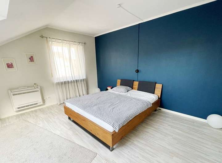 Folgt man der schönen, offenen Treppe in das Dachgeschoss, finden sich hier das Tageslichtbad mit zwei Waschbecken, WC, Dusche und Badewanne, ein geräumiges Elternschlafzimmer mit Klimaanlage, viel Platz für ein Doppelbett und Kleiderschrank und ein kaum kleineres Kinderzimmer, das aktuell mit einem großen Pax Kleiderschrank ausgestattet ist, der gerne übernommen werden kann.