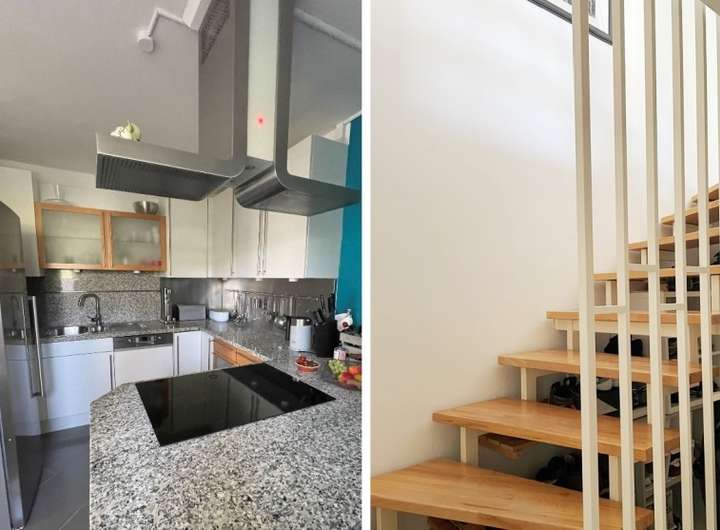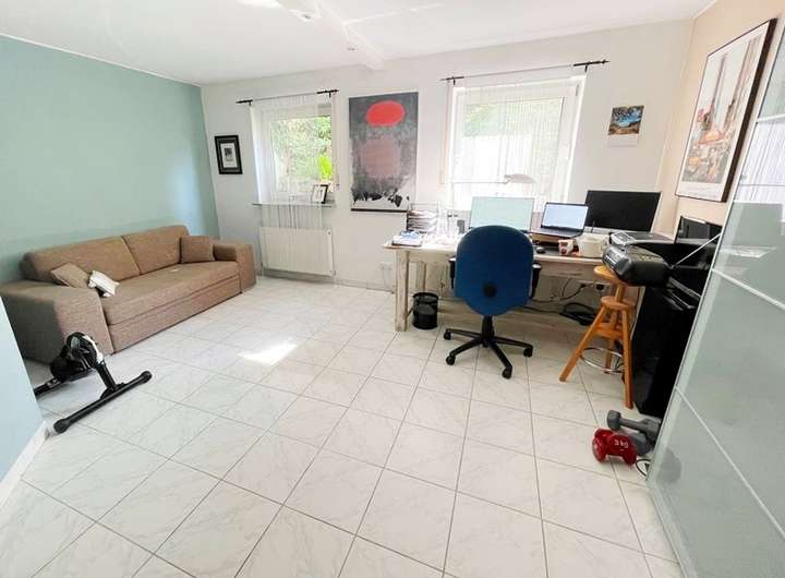 Im Untergeschoss steht ein wohnlich ausgebautes Arbeitszimmer, eine Waschküche und ein praktischer Abstellraum zur Verfügung. Insgesamt ist das Haus in weiten Teilen bereits modernisiert – siehe Ausstattungsliste – und in einem sehr gepflegten Zustand. Die Böden sind mit dunkeln Fliesen und Laminat ausgelegt. Der gemeinschaftlich genutzte Hausanschlussraum mit den jeweils separaten Heizungen und Anschlüssen, liegt im Untergeschoss und ist über eine Außentreppe für beide Parteien zugänglich. Abgerundet wird dieses interessante Angebot mit einer Einzelgarage wenige Meter vom Haus entfernt.