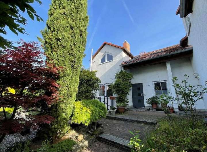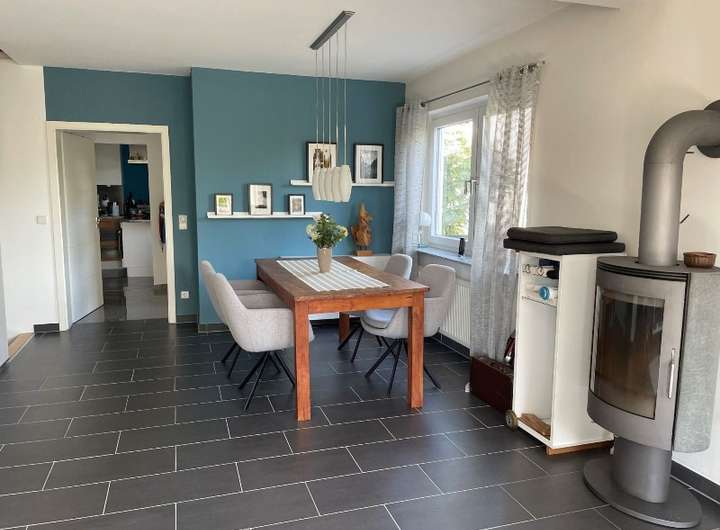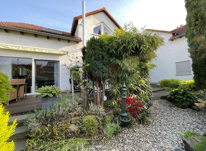 Das ca.1995 erbaute Doppelhaus steht auf einem ca. 571m² großen Grundstück, welches über einen gemeinsamen Eingangsbereich zugänglich ist und zu den separaten Eingängen der Doppelhaushälften führt. Die ca. 120m² Wohnfläche des Hauses, biete im Erdgeschoss einen großzügigen, lichtdurchfluteten Wohn- und Essbereich mit schönen Fliesen, Klimaanlage, Blick und Zugang auf die Terrasse mit Markise und den ca. 100m² großen Garten sowie einem Kaminofen für gemütliche Abendstunden. Die helle Küche mit Tresen, lädt zur Geselligkeit beim Kochen ein und ist mit hochwertigen Einbauten für die täglichen Bedarf ausgestattet. Im Flur darf natürlich neben einem Platz für die Garderobe ein Gäste – WC nicht fehlen.