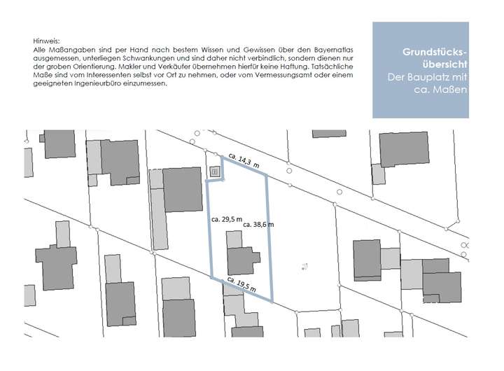 Alle weitergehenden Fragen zur baulichen Nutzung sind vom Kaufinteressenten selbst mit der zuständigen Baubehörde zu klären. Makler und Verkäufer übernehmen diesbezüglich keine Haftung.