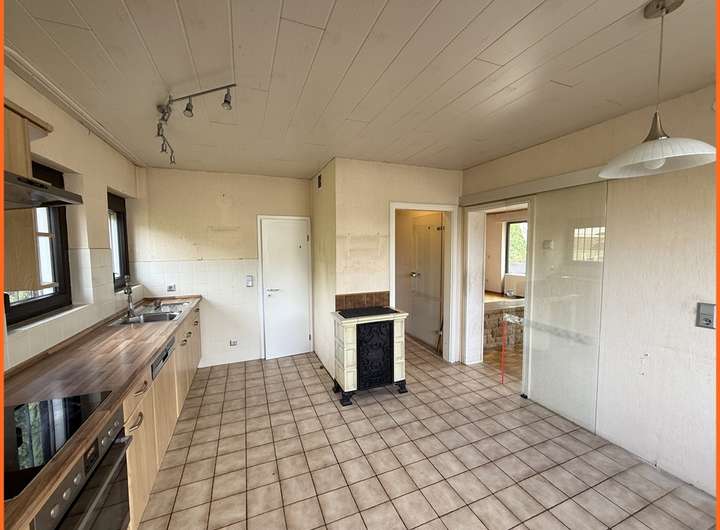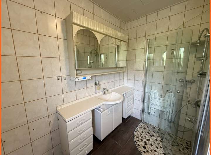 Die Hauptebene mit Wohn-Esszimmer, großem überdachten Balkon, Küche mit Einbauten, Diele, Schlafzimmer, Duschbad und Gäste-WC wurde 2012 modernisiert. Diese Etage hat eine moderne Pelletsheizung.
