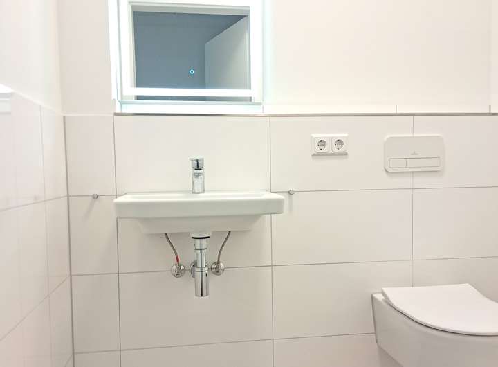 Ein besonderes Highlight ist die großzügige Terrasse, die ideal zum Entspannen einlädt: Genießen Sie hier sonnige Stunden oder ein gemeinsames Sonntagsfrühstück mit der ganzen Familie. Das stilvolle Tageslichtbad überzeugt mit einer bodengleichen Dusche und einer Badewanne. Großformatige, helle Fliesen unterstreichen den modernen Charakter der Wohnung. Die hochwertigen Armaturen stammen von Villeroy & Boch – einem Hersteller, der für zeitloses Design und hohe Qualität bekannt ist.