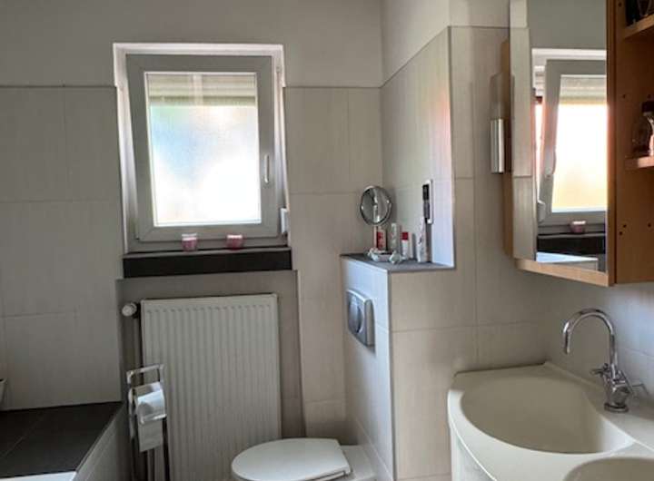 Außer dem Wohnzimmer und der Küche befinden sich im EG das Badezimmer mit Wanne und Doppelwaschbecken. Der Flur und ein weiteres Zimmer runden das Raumangebot im EG ab.