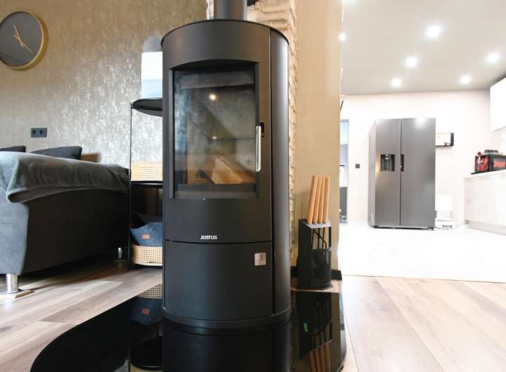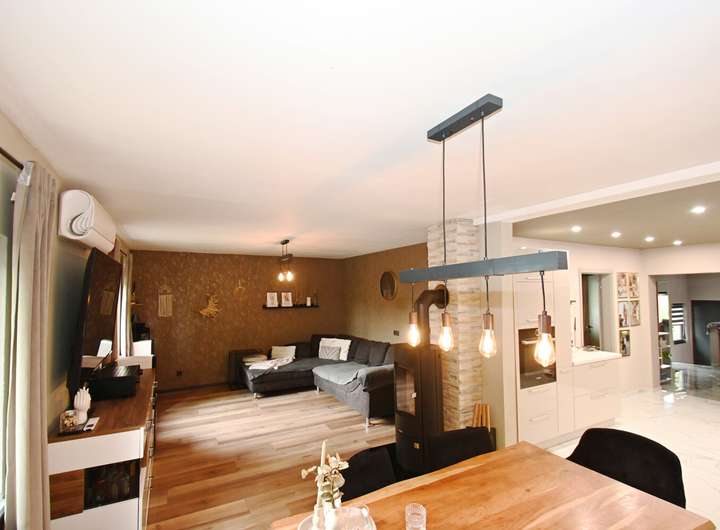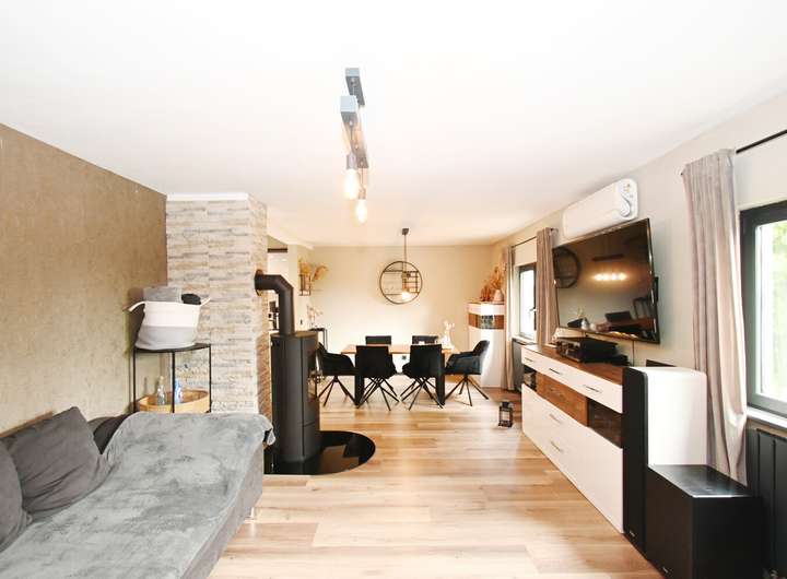 Der angrenzende Essbereich bietet genug Raum für Familie und Gäste. Ein Kamin mit 9 kW Nennleistung sorgt an kühleren Tagen für wohlige Wärme und eine besondere Atmosphäre.