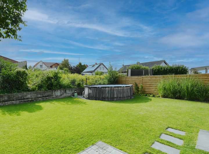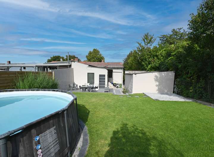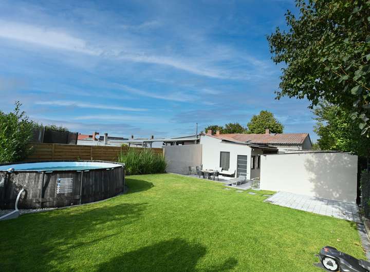 Bereits beim Betreten des Hauses fällt die offene, lichtdurchflutete Gestaltung auf. Der Wohnbereich ist zur großen Terrasse (ca. 30 m²) hin ausgerichtet, welche direkt in den Garten führt. Bodentiefe, einbruchhemmende Fenster gewährleisten Helligkeit und gewähren zugleich einen harmonischen Übergang nach außen – ein Fensterelement im Wohnbereich verfügt über ISO-Dreifachverglasung, alle anderen Fenster wurden mit ISO-Zweifachverglasung erneuert.