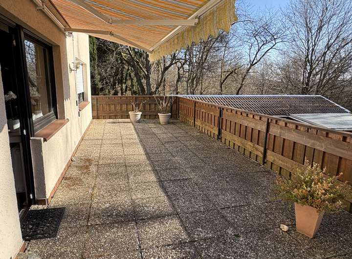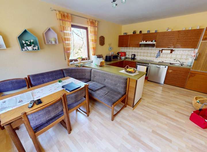 Der offene Wohn- und Essbereich im Erdgeschoss ist hell und freundlichen gestaltet und überzeugt durch große Fenster, die viel Tageslicht hereinlassen. Von hier aus haben Sie Zugang zu einem großen Balkon, der einen malerischen Blick in den Garten und den umliegenden Wald bietet. Eine große Küche ergänzt das Erdgeschoss.