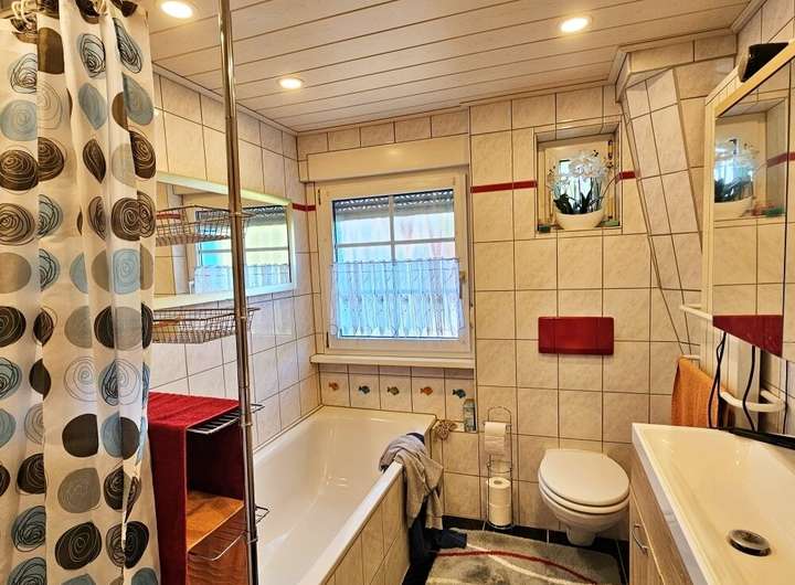 Das Badezimmer im 1. Obergeschoss ist deckenhoch gefliest und mit zeitlosen Sanitärobjekten ausgestattet.