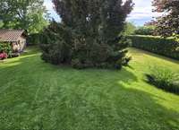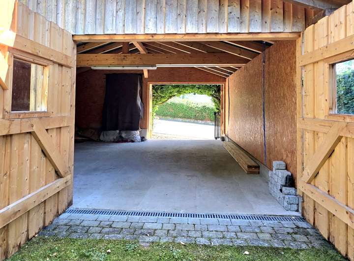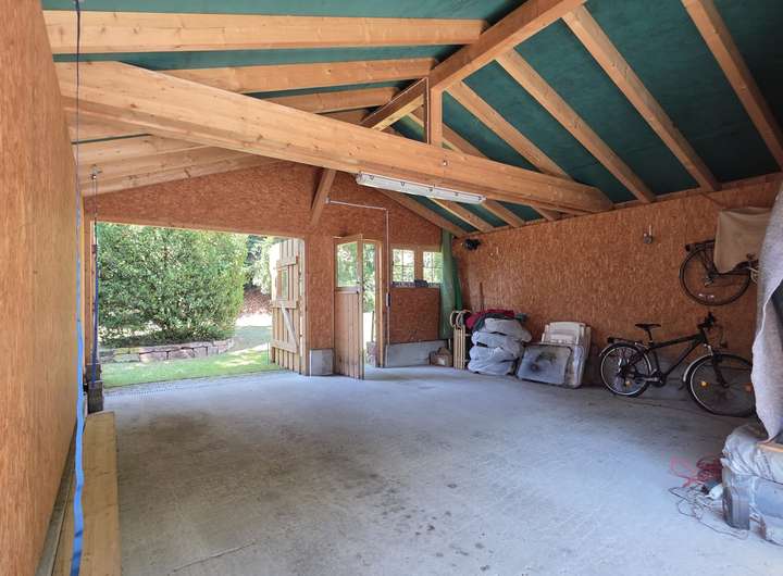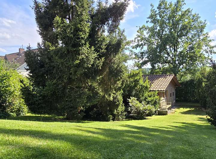 2011 wurde in einer Ecke des Grundstücks ein maroder Carport aus den 50er Jahren durch eine hoch solide Gartenhütte mit Betonfundament und Tonziegeleindeckung in den Maßen 6m x 6m ersetzt.