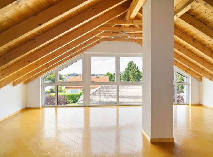 Neben dem Hauptschlafzimmer mit begehbarem Kleiderschrank stehen zwei weitere Zimmer zur Verfügung, eines davon mit Küchenanschlüssen. Eine Wendeltreppe führt in den oberen Bereich mit Bürofläche, Heizungsraum und einem großzügigen Zimmer mit Fensterfront bis in den Giebel – hier reicht der Blick weit über die Nachbarschaft bis in die Rheinlandschaft. Ein helles Bad mit Dusche und WC ergänzt die Einheit.