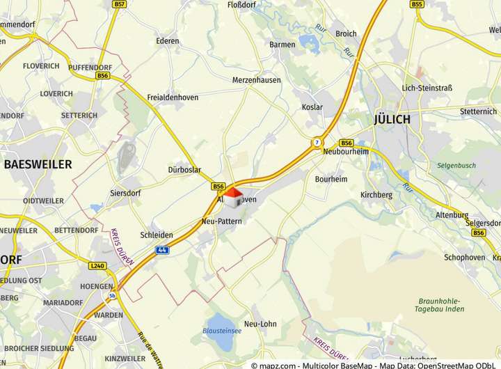 Aldenhoven, mit rund 14.300 Einwohnern, liegt im Dreieck Aachen, Köln, Düsseldorf, direkt an der A 44 und gehört zum Kreis Düren. Die B 56 sowie die ehemaligen B 1 (heute L 136) verlaufen durch Aldenhoven und der Ort verfügt über den Autobahnanschluss „Aldenhoven“ auf der A 44. Aldenhoven gehört zum Aachener Verkehrsverbund (AVV). Die Gemeinde wird per Bus mit allen Nachbargemeinden Alsdorf, Baesweiler, Eschweiler, Jülich und Linnich verbunden. Außerdem bestehen umsteigefreie Verbindungen nach Aachen und Geilenkirchen.