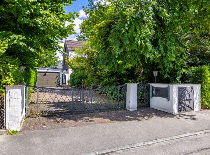 In einer der begehrtesten, absolut ruhigen Wohnlagen im Süden von Königsbrunn erwartet Sie dieses ca. 922 m² große, rechteckig geschnittene Grundstück – ein wahres Juwel. Die lange, repräsentative Zufahrt mit elektrischem Tor wirkt wie eine private Allee, eingerahmt von sattem Grün. Am Ende befinden sich eine Einzelgarage und ein zusätzlicher Carport – beide bequem erreichbar.