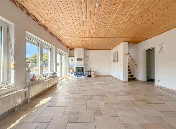 Im Erdgeschoss empfängt Sie ein lichtdurchflutetes Wohnzimmer mit Kamin und großen Fensterflächen, die den Blick ins Grüne freigeben und den Raum mit natürlichem Licht durchfluten. Von hier aus gelangen Sie direkt auf den großzügigen Balkon, der zu entspannten Stunden an der frischen Luft einlädt. Der angrenzende Essbereich ist durch eine praktische Durchreiche direkt mit der Küche verbunden, die mit einer Einbauküche ausgestattet ist. Ebenfalls auf dieser Ebene befindet sich ein Gäste-WC.