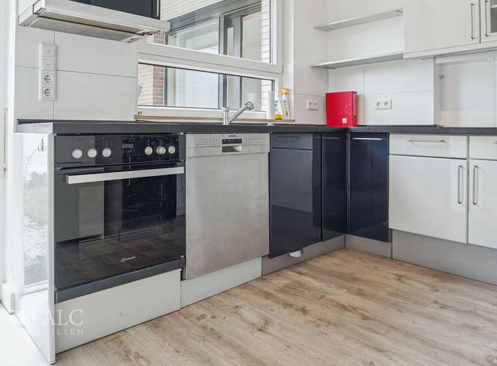 Die Küche, die direkt an das Wohnzimmer angrenzt, ist funktional gestaltet und bietet ausreichend Platz für kulinarische Kreationen. Eine praktische Durchreiche bietet die Möglichkeit, Speisen und Getränke direkt ins Wohnzimmer zu reichen.