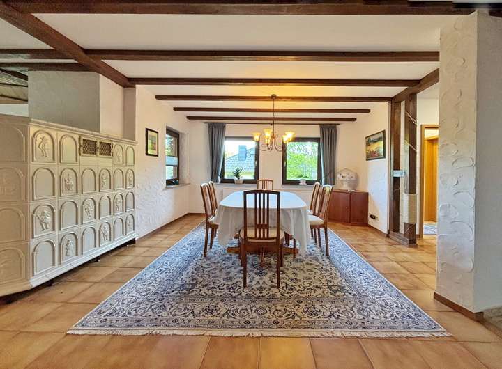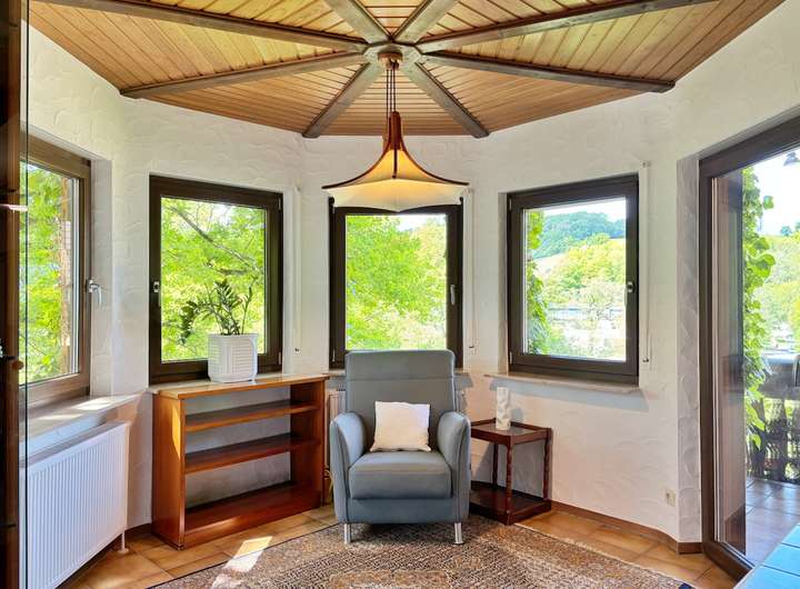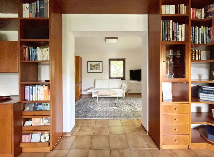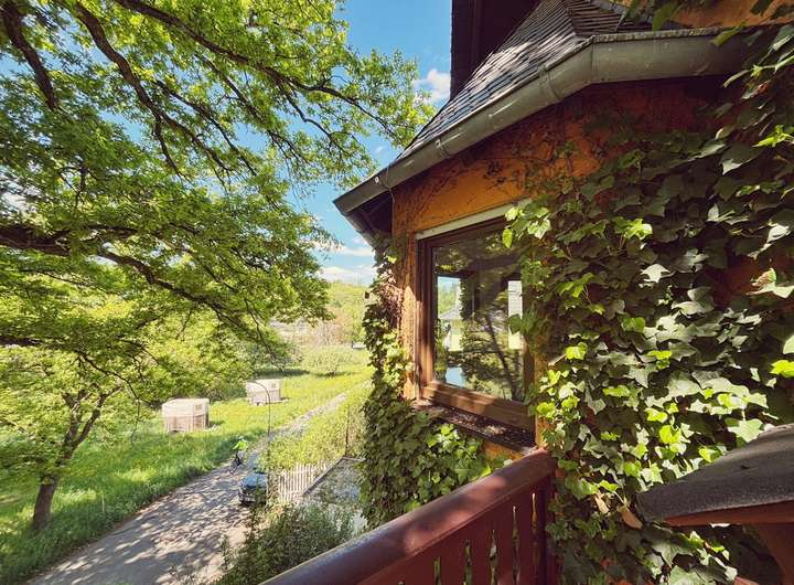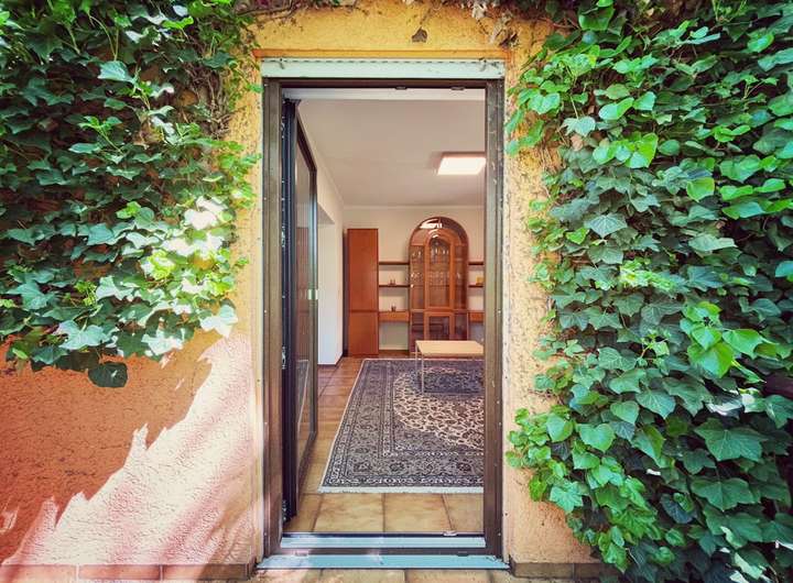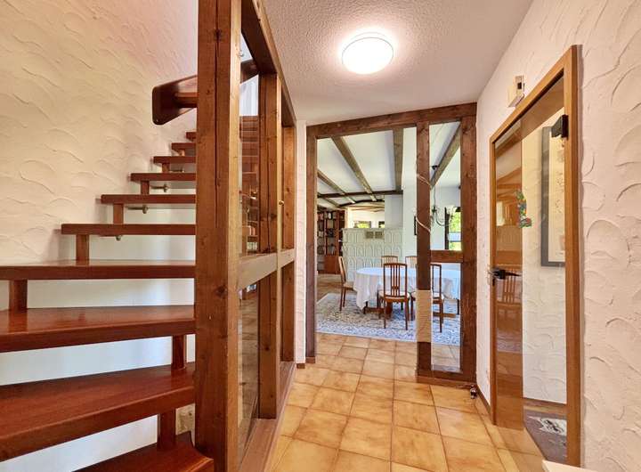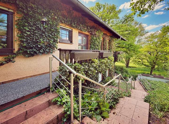 In sanfter Hanglage, nur wenige Minuten vom Stadtleben entfernt, liegt dieses besondere Einfamilienhaus, eingebettet in eine grüne Umgebung. Der weitläufig angelegte Vorgarten schafft bereits im Eingangsbereich eine einladende Atmosphäre und unterstreicht den individuellen Charme des Hauses.