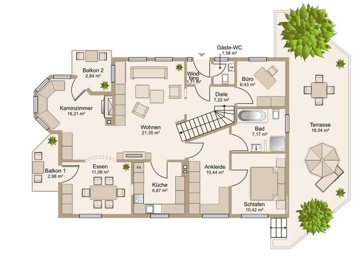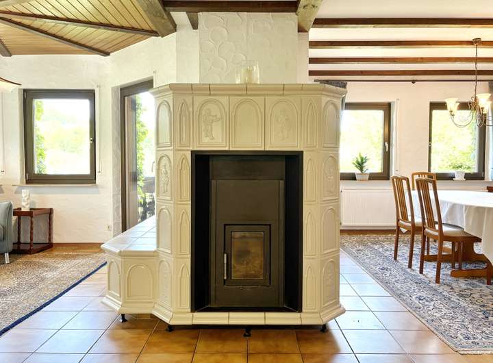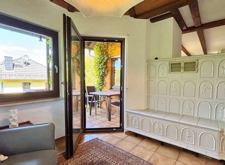 Das großzügig gestaltete Wohn-Esszimmer bildet das Zentrum des Hauses. Zwei Balkone schaffen fließende Übergänge zwischen innen und außen und erweitern den Wohnbereich auf harmonische Weise. Der hochwertige Kachelofen der Firma Leda mit moderner Technik sorgt nachhaltig für wohlige Wärme und setzt gleichzeitig einen gestalterischen Akzent. Besonders schön sind die neutralen weißen Kacheln – aber natürlich ließe sich das auch anders gestalten. Das angrenzende, lichtdurchflutete Erkerzimmer verleiht dem Haus sowohl architektonisch als auch atmosphärisch eine besondere Note.