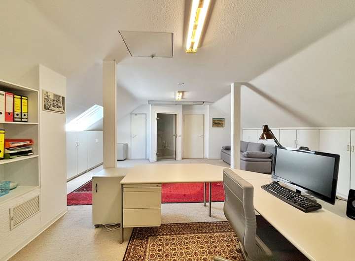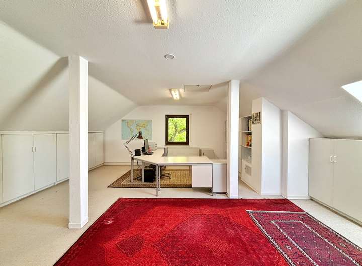 Im teilweise ausgebauten Dachgeschoss stehen zwei große Räume zur Verfügung, flexibel nutzbar als Atelier, Jugendbereich, Homeoffice oder Rückzugsort. Durch das Einziehen zusätzlicher Wände ließe sich hier ein weiterer Raum schaffen. Ein kleines Badezimmer wäre in diesem Bereich eine wunderbar praktische Ergänzung.