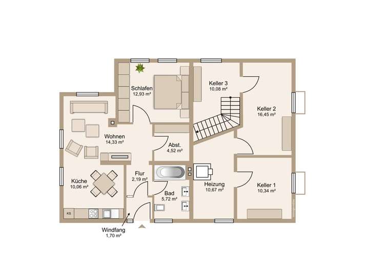 Das Kellergeschoss ist ein Vollgeschoss, somit zeichnen sich die hinteren Räume, die als Kellerräume genutzt werden durchgängig durch eine sehr hohe Deckenhöhe aus.