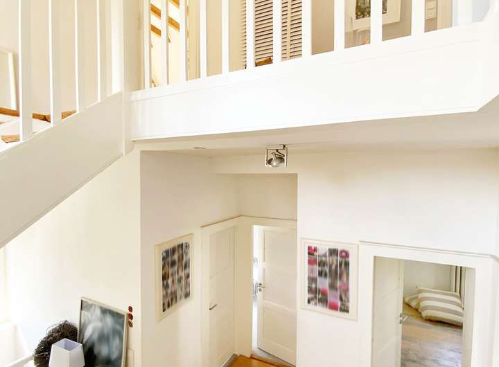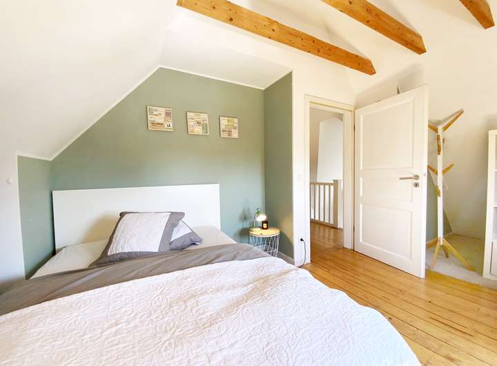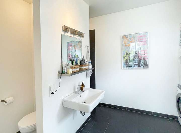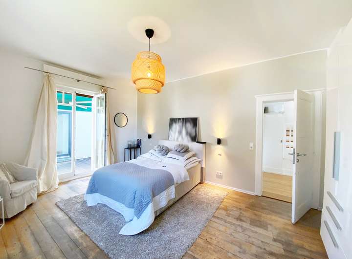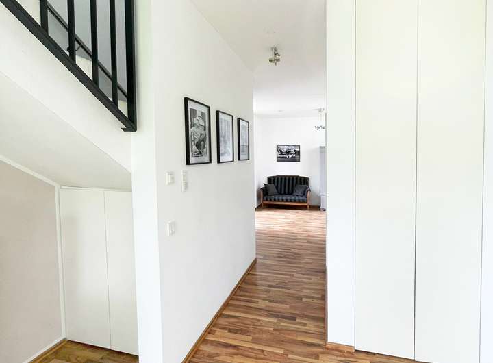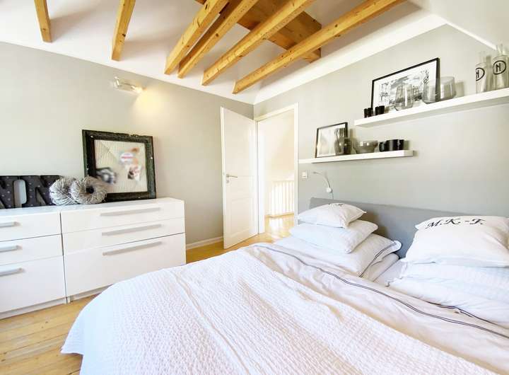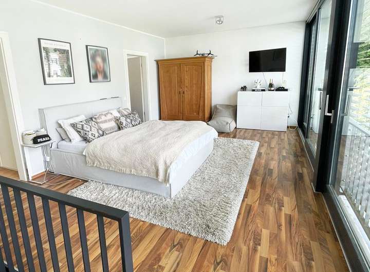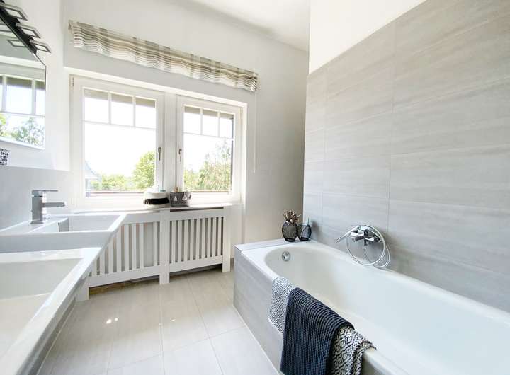 Im Obergeschoss erwartet Sie ein geschmackvoll ausgestattetes Badezimmer mit Wanne und Dusche sowie ein großzügiges Ankleidezimmer. Von hier aus kann optional der direkte Zugang zur separaten Einheit genutzt werden.