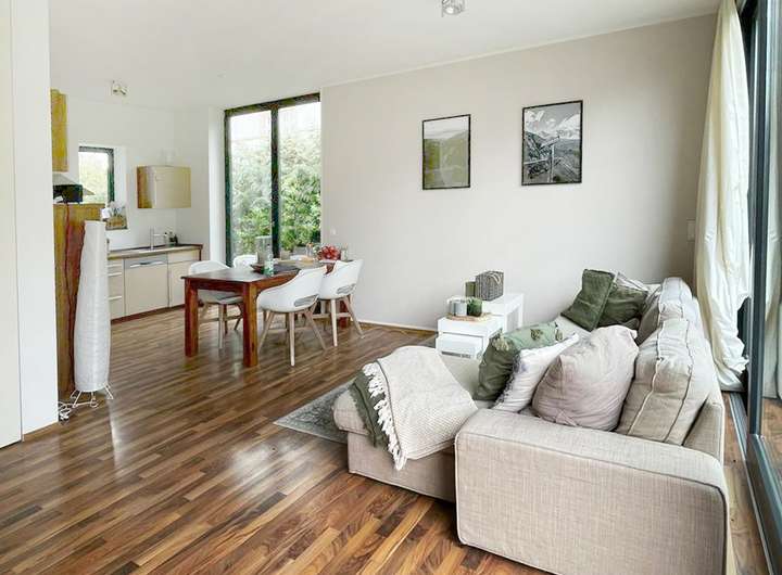Im Erdgeschoss des Hauptbereichs befindet sich ein offener Wohn- und Essbereich mit angrenzender Küche – der perfekte Ort für gemeinsames Leben und Genießen. Ein Gäste-WC bietet zusätzlichen Komfort.
