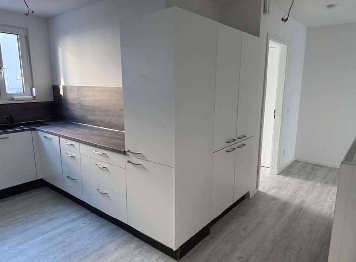 Eine moderne Einbauküche mit weißer Front und anthrazitfarbener Arbeitsplatte und modernen Einbaugeräten wurde eingebaut.