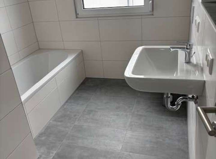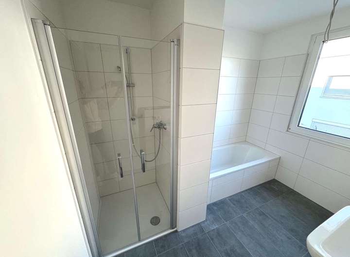 Die Wände hinter Dusche und Badewanne sind deckenhoch weiß gefliest, der Boden mit hellgrauen Fliesen belegt. Ein Handtuchheizer steht zu Diensten.