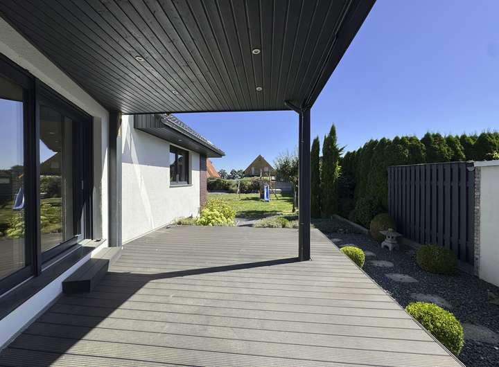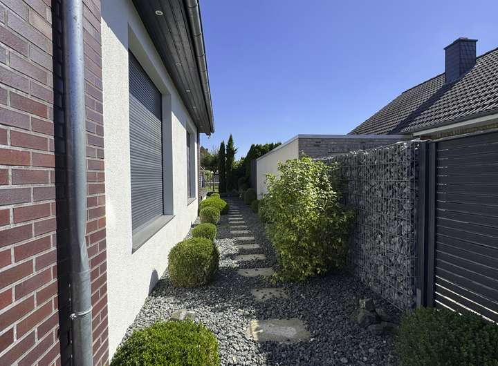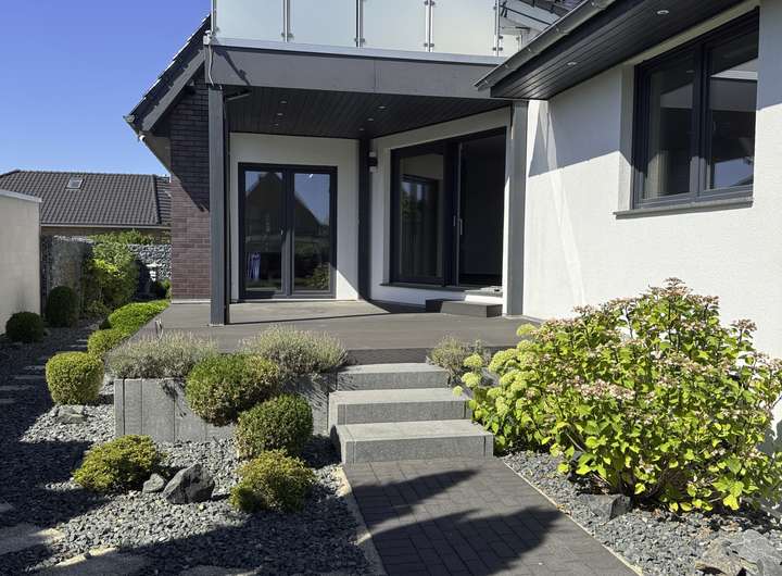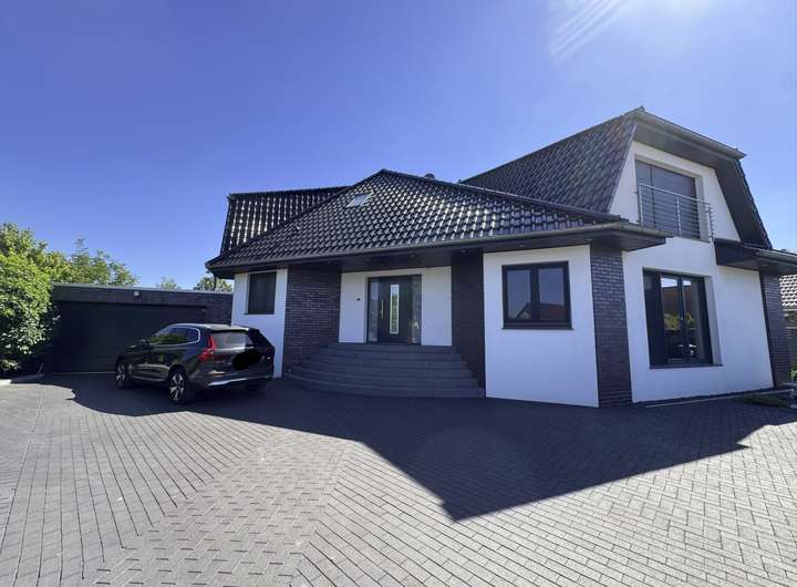 Diese exklusiv gestaltete Villa aus dem Jahr 2024 bietet auf rd. 360 m² Wohnfläche repräsentatives und komfortables Wohnen. Die Zufahrt auf das Grundstück ist gepflastert, so dass vor der Doppelgarage noch mehrere Fahrzeuge geparkt werden können. Bereits der einladende Hauseingang mit dem durch Glas strukturierten Türelement lässt die Großzügigkeit der Wohnräume erahnen. Rechts des Entrees liegt der lichtdurchflutete Wohnbereich, der durch detailliert gestaltete Deckenabhängungen und Öffnungen bis hinauf in das Obergeschoß ein außergewöhnliches Wohnen ermöglicht. Das Haus wird über eine Fußbodenheizung geheizt, die Warmwassererzeugung findet mit Solarunterstützung statt, zusätzlich ist der Kamin Wasserführend. Die Küche mit Zugang zur Terrasse bietet zudem Platz für einen herrlichen Sitzbereich. Weiterhin befinden sich im Erdgeschoß ein Gäste-WC sowie zwei Zimmer, eines mit Ankleide en suite und ein schickes Duschbad. Im Obergeschoß finden sich vier weitere Zimmer, eines davon mit Galeriebereich mit Blick in den Wohnraum. Eines der Zimmer verfügt über einen Zugang zum Balkon und bietet eine weitere Ankleide. Das Bad auf dieser Etage überzeugt mit Dusche und einer separaten Wanne in einem großzügigen Grundriss. Der großräumige Keller weist einen erstklassigen Saunabereich auf, mit sowohl einer Dampf- als auch mit einer Aufgußsauna. Ein großer Hobbyraum steht hier ebenfalls zur Verfügung. Der Garten bietet mit einer nach Süden ausgerichteten und einem Bachlauf gestalteten Ruhefläche, viel Rasen zum spielen und Genießen. Eine überdachte 2. Terrasse mit anschließender Gartenküche und Durchgang zur Doppelgarage rundet dieses exklusive Angebot ab.