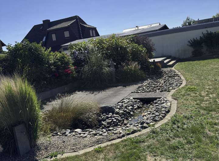 Wohnraum mit bodentiefen Fenstern Wasserführender Kamin Flurgestaltung mit attraktiver Lichtführung erhöhte, teilüberdachte Terrasse mit wuderbarem Blick in den Garten (Süd-Ostausrichtung) großes Gäste-WC im Erdgeschoß Duschbad im Erdgeschoß mit bodengleicher Dusche Eltern-Schlafzimmer, links mit angrenzender, begehbarer Ankleide Dusch- und Wannenbad im Obergeschoß WC mit dahinterliegendem Abstellraum im Untergeschoß Finnische Sauna, rechts daneben mit geräumiger Duschmöglichkeit Beheizbare Liegen Hobbyraum im Keller Ruhebereich mit Bachverlauf im Osten des Gartens