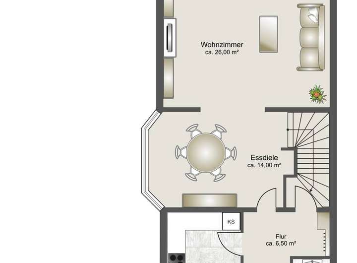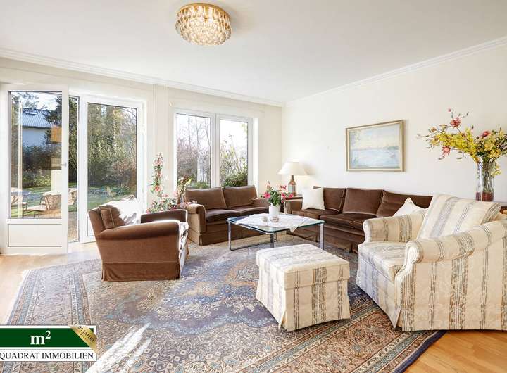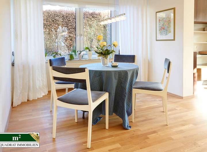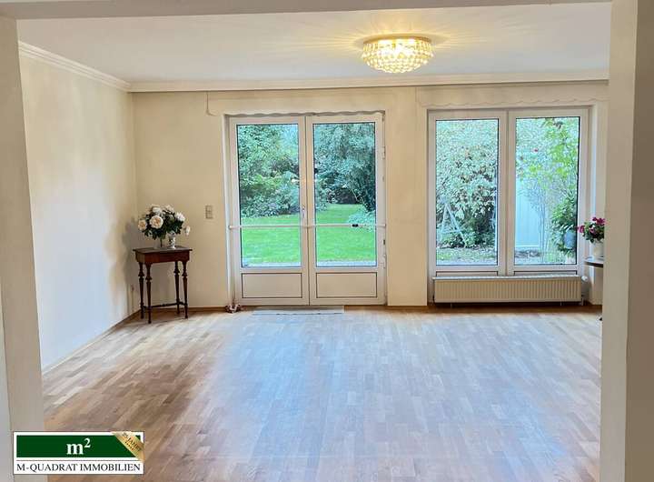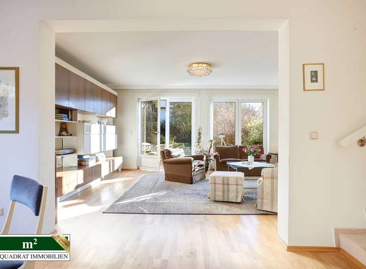 Von der Haustür aus, geradezu, werden sie in das Zentrum des Hauses, die Wohnräume für gesellige Zusammenkünfte geleitet. Es gibt einen leicht separierten Essbereich vor dem Erkerfenster, an den sich der offene, gemütliche Wohnbereich anfügt. Von hieraus haben sie einen herrlichen Blick sowie Zugang in den parkähnlichen Garten. Eine „Hamburger Altstadtlaterne“ sorgt in den Abend- und Nachtstunden für eine schöne Beleuchtung des Gartens und lässt sie diesen lange genießen.