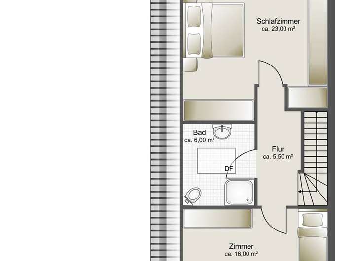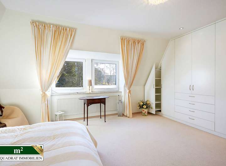 Von Wohnbereich führt eine massive Steintreppe in das Dachgeschoss zu den Privaträumen mit aktuell zwei Schlafzimmern. Im großen Zimmer finden sie maßgefertigte Tischler-Einbauschränke, die sehr viel Stauraum für Ihre Kleidung und weiteres bieten. Bei Bedarf könnte dieses Zimmer in zwei Räume geteilt werden.