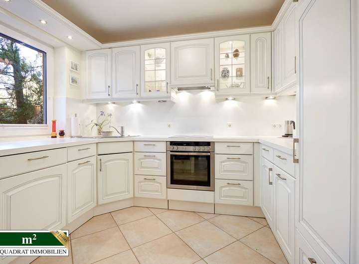 Das hyggelige Haus empfängt sie in einer hellen Diele und führt sie linksseitig in die gepflegte „Nolte“-Landhausküche mit viel Stauraum. Ein großer Apothekerschrank, die Eckspüle und die beleuchteten Vitrinenschränke sind einige Besonderheiten. Hier kommt die Familie gerne zum Kochen und Backen zusammen.
