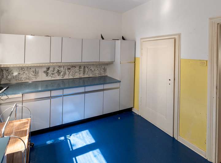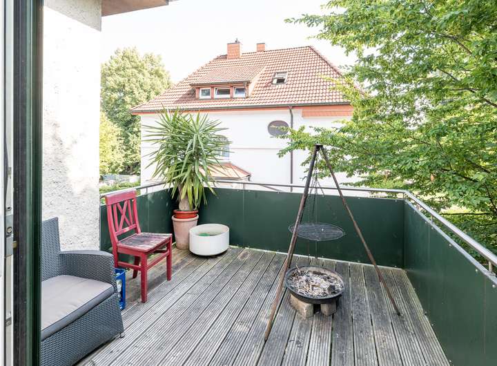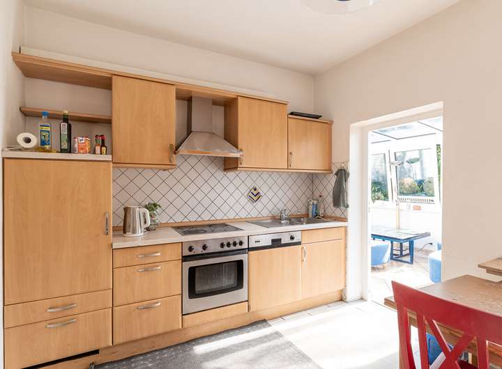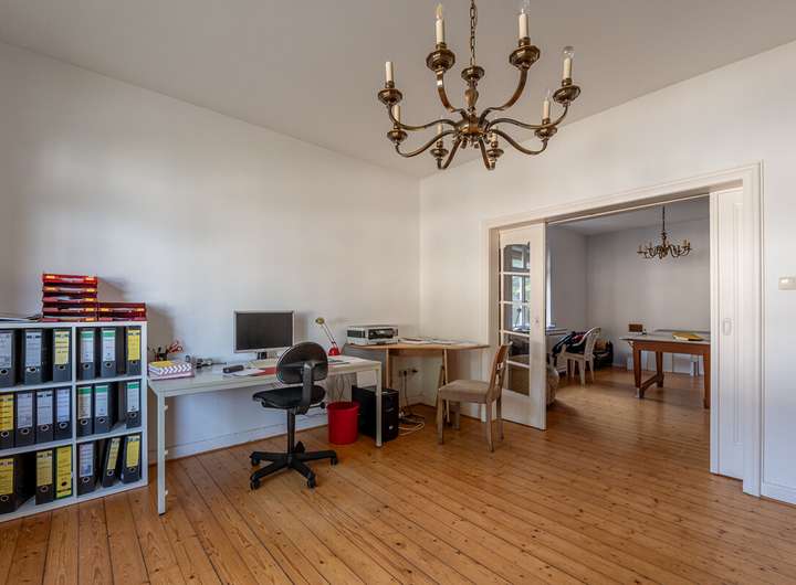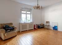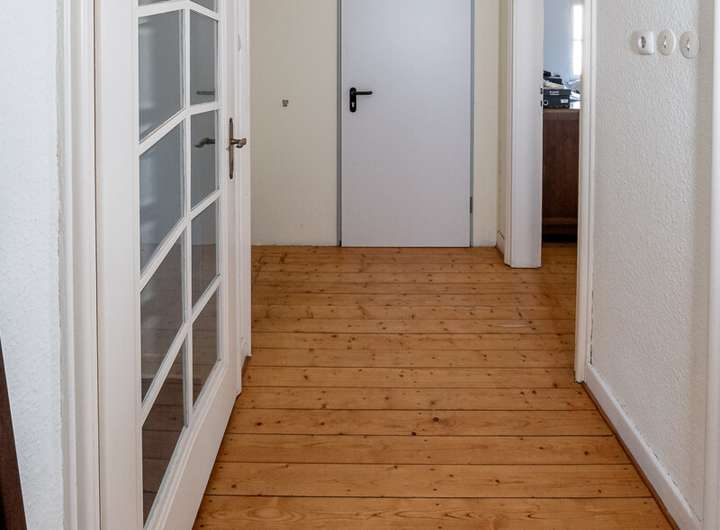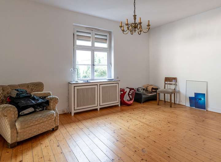 Die Gesamtwohnfläche umfasst ca. 155 m². Zusätzlich gibt es drei ausgebaute Räume im Spitzboden, die über das Treppenhaus erreichbar sind. Im Erdgeschoss befinden sich ein Wohnzimmer und ein Esszimmer (Deckenhöhe ca. 2,80 m) mit Holzdielen, getrennt durch eine erhaltene Holzschiebetür mit Glaseinsätzen, eine Küche mit angrenzender Speisekammer, ein Gäste-WC im Eingangsbereich sowie ein Anbau mit Zugang zur Terrasse.