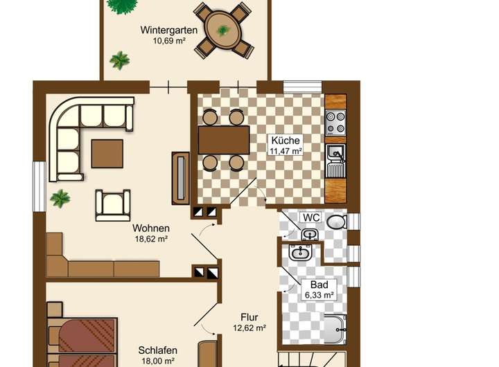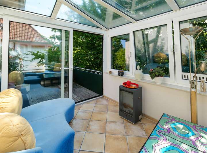 Im Obergeschoss befinden sich ein geräumiges Wohnzimmer mit Zugang zu dem Wintergarten, Schlafzimmer, eine Küche, ein Flur, ein Badezimmer mit Eckdusche sowie ein separates WC – beide mit Fenstern. Der 2001 errichtete Wintergarten mit Balkon erweitert diese Etage um einen lichtdurchfluteten, wohnlichen Bereich und steigert die Aufenthaltsqualität.