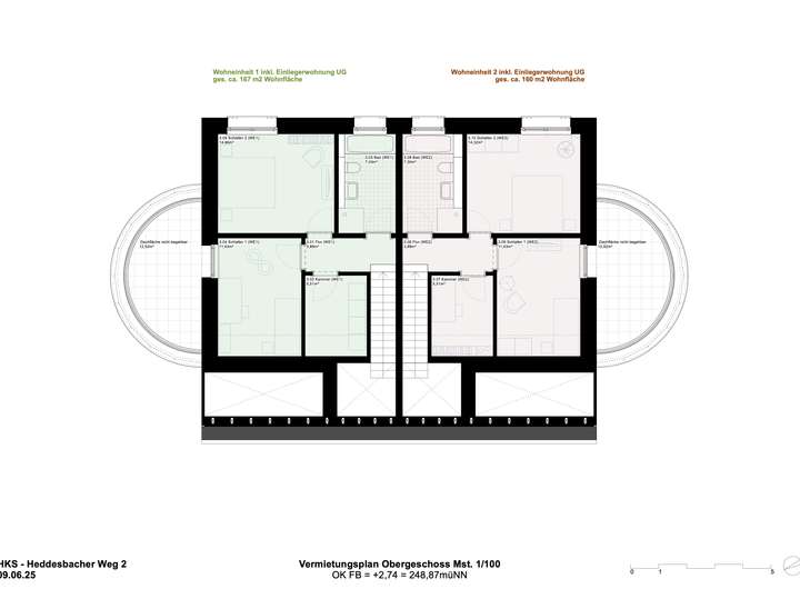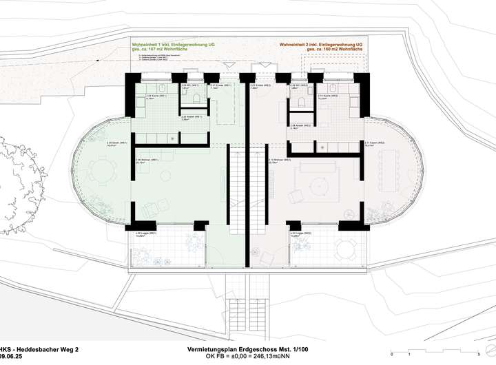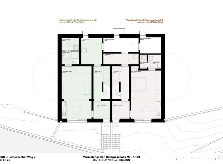 Aktuell werden im Heddesbacher Weg 2 zwei nahezu baugleiche Wohneinheiten bzw. Haushälften fertiggestellt, die nach der Kernsanierung einen Neubauzustand haben. Beide Einheiten sind jeweils mit einem Badezimmer, Gäste WC und einem Duschbad ausgestattet. Der Einbau einer Küche wird Mietersache sein. Aufteilung der Zimmer siehe Grundriss. Im Souterrain ist eine kleine Einliegerwohnung mit separatem Eingang abtrennbar. Ideal beispielsweise für einen Großelternteil, als autarkes Jugendzimmer, Homeoffice, Hobbykeller oder einfach als Zimmer nutzbar. Bäder, Küchen- und Eingangsräume sind mit hochwertigen Fliesen ausgestattet, die übrigen Wohnräume haben einen Echtholz-Parkettboden. Die Holz-Aluminium-Fenster sind dreifachverglast, der insgesamt hohe Energiestandard wird sich in geringen Heizkosten bemerkbar machen. Heizung und Warmwasserbereitung erfolgt durch eine effiziente Wärmepumpe. Für die Stromversorgung steht eine Photovoltaik-Anlage mit großem Speicher zur Verfügung. Dadurch kann ein vergünstigter Stromtarif als Mieterstrommodell angeboten werden (vrstl. 30ct/kWh). Zudem gibt es auf allen Geschossen eine Wohnraumlüftung. Beide Einheiten beinhalten einen separaten Garagenstellplatz (Anschlussmöglichkeit für Wallboxen besteht) und einen weiteren Stellplatz im Freien nach Bedarf. Zudem steht jeder Wohneinheit eine Loggia und eigene Gartenfläche nach Absprache zu.