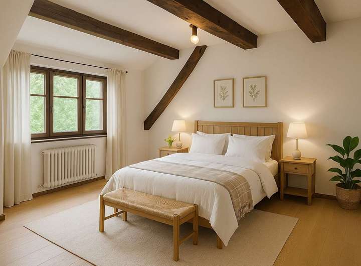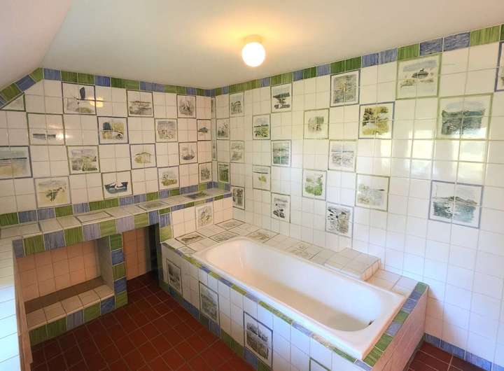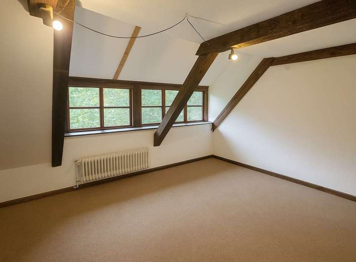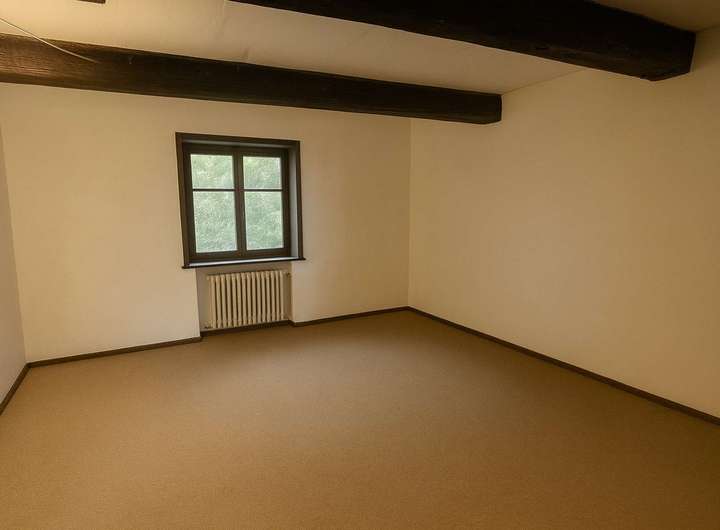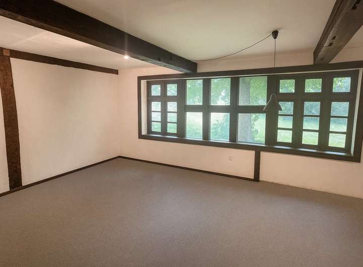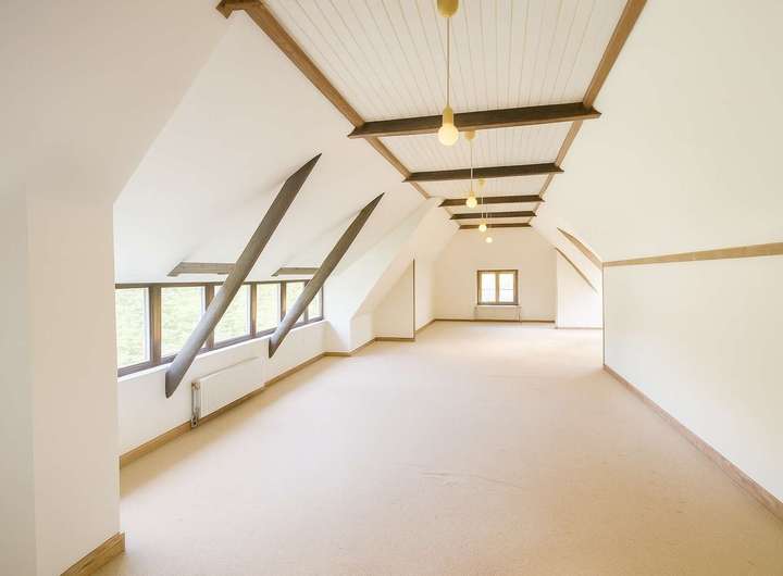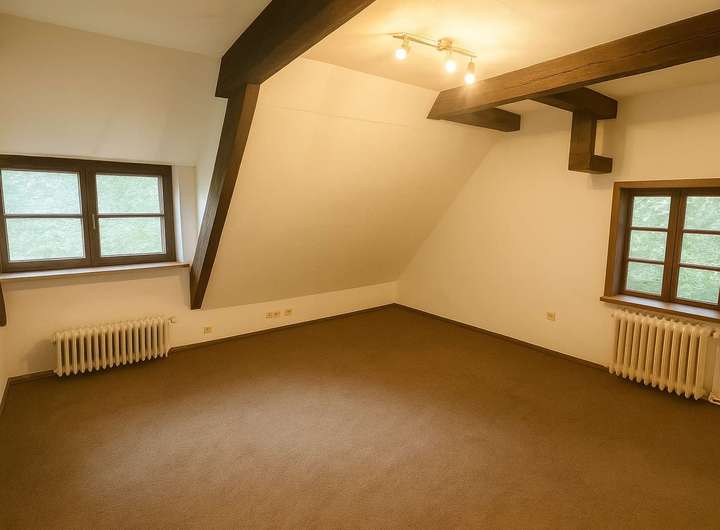 Ein besonderes Highlight ist das Atelier im Obergeschoss, das kreativen Geistern viel Raum zur Entfaltung bietet. Der Bodenbelag besteht aus einer Kombination von Fliesen und Teppichboden, was für eine angenehme Wohnatmosphäre sorgt.