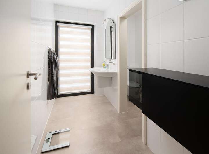 Der Einliegerbereich, welcher mit der Hauptwohnung durch eine Tür verbunden ist, verfügt über drei Zimmer, die über den Flur erreicht werden können. Eines der Zimmer bietet Anschlüsse für eine Küche, was eine autonome Nutzung ermöglicht. Ein voll ausgestattetes Duschbad ist ebenfalls vorhanden.