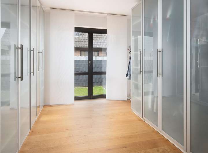 Über die große, mit Klinkersteinen belegte Auffahrt gelangen Sie zum Haupteingang des Hauses. Dahinter erwartet Sie ein Windfang, von dem Sie wahlweise in den Haupt- oder Einliegerbereich gelangen. Des Weiteren steht dort ein Gäste-WC zur Verfügung.