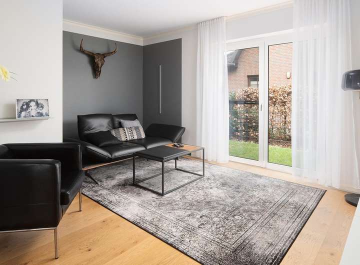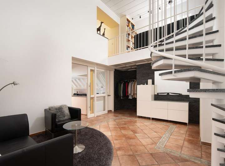 In der Hauptwohnung bildet die Galerie das Zentrum des Hauses. Von hier aus gibt es die Möglichkeit in die erste Etage zu gelangen oder in den ca. 45 m2 großen Wohn- und Essbereich. Dieser ist ein architektonisches Highlight und bietet genügend Platz für ein schönes Familientreffen. Durch die offene Raumgestaltung ist die neuwertige Küche über eine Empore zu erreichen und hat direkten Zugang zur Terrasse und dem traumhaft gestalteten Garten.