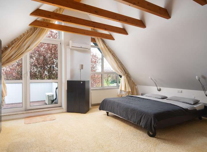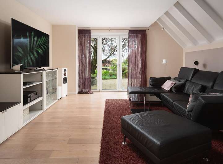 Über die Galerie im Obergeschoss erhalten Sie Zugang zum Hauptschlafzimmer, welches über ein eigenes Bad verfügt. Die sichtbaren Balken verleihen dem Schlafzimmer seinen Charme. Ein Balkon bietet einen herrlichen Überblick über den Garten. Im Obergeschoss befinden sich noch zwei weitere Zimmer, zurzeit als Ankleide- und Sportzimmer genutzt.