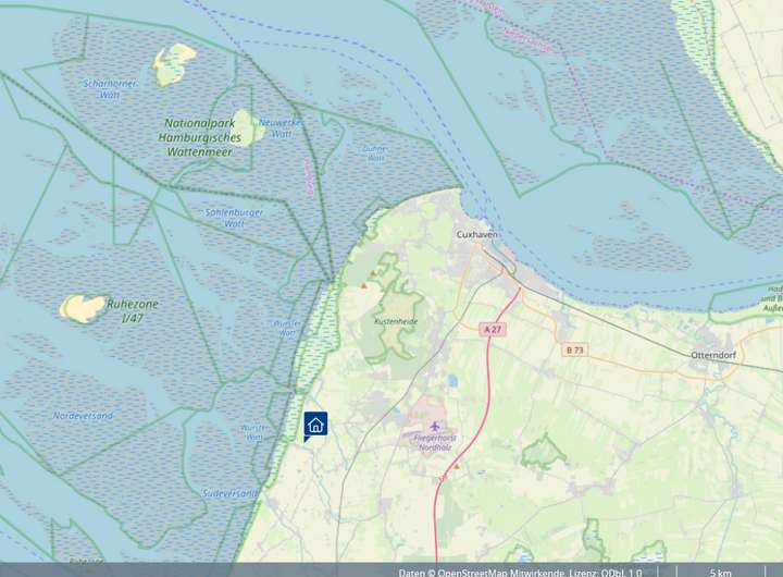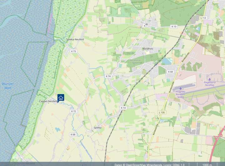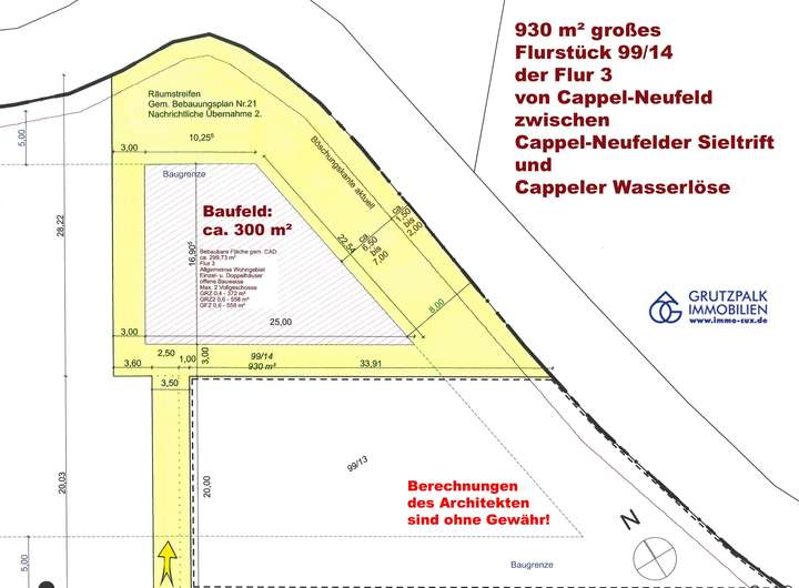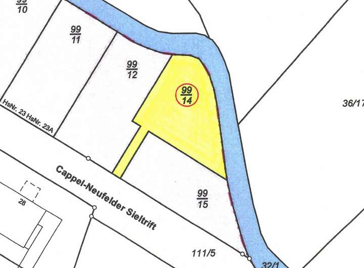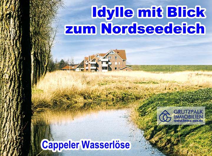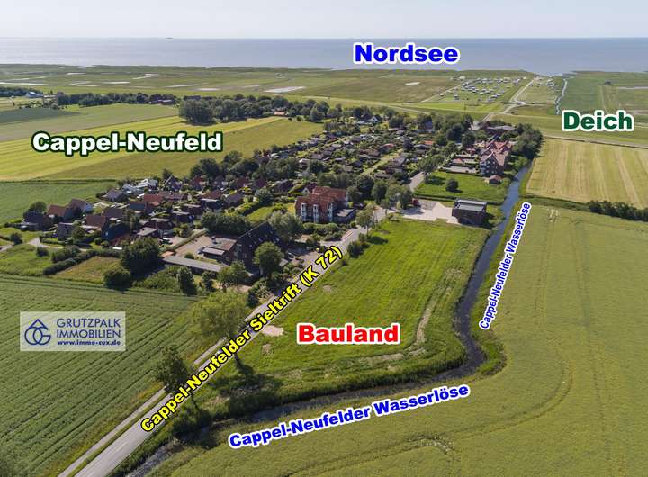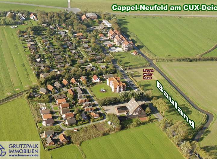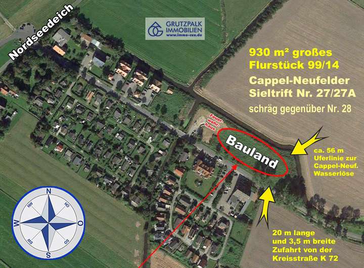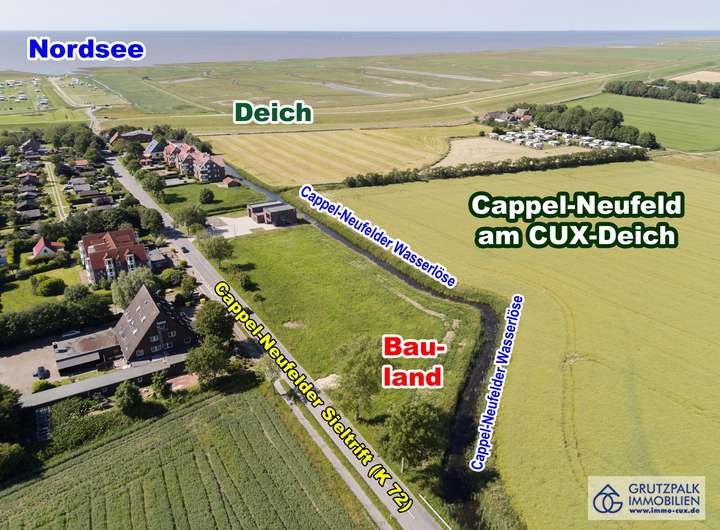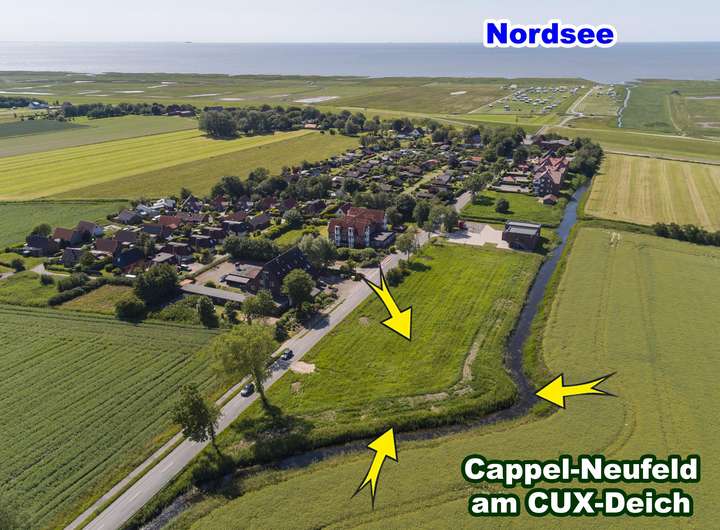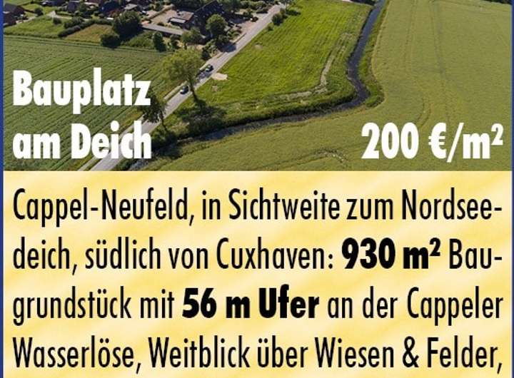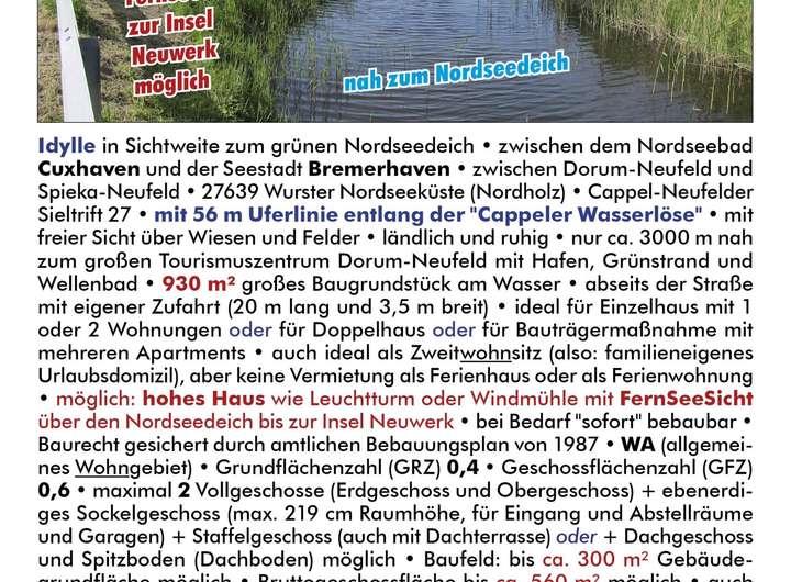 Träumen Sie davon, ein Haus in Form eines Leuchtturms, eines Wasserturms oder einer Windmühle zu bauen, und dann ganz oben mit FernSeeSicht über den Nordseedeich bis zur Insel Neuwerk? Dies könnte Ihr DOMIZIL am DEICH werden - für den eigenen Urlaub oder dauerhaft zum Wohnen! Die idyllische Lage dieses Baugrundstücks im CUXLAND in Sichtweite zum Nordseedeich hat viele Vorteile. Wenige Worte reichen dafür nicht aus. Wegen der Top-Lage direkt an der Cappeler Wasserlöse geht ihr freier Blick über Wiesen und Felder und zum Nordseedeich. Cappel-Neufeld gehört zu Nordholz. Nordholz gehört zur Wurster Nordseeküste. Die Gemeinde Wurster Nordseeküste gehört zum Landkreis Cuxhaven. Cappel-Neufeld ist ein kleiner Ort am Deich zwischen dem Nordseebad CUXHAVEN und der auch touristisch interessanten Seestadt BREMERHAVEN. Von der Anschlußstelle Nr. 3 (Nordholz) der Autobahn A 27 fahren Sie nur ca. 11 bis 12 km bis zu Ihrem Bauplatz. Ihre frischen Krabben und Ihren frischen Fisch holen Sie sich von dort nur ca. 3,5 km nah im nördlichen Nachbarort Spieka-Neufeld. Das nächste Tourismuszentrum mit einem großen Schwimmbad als Wellenfreidbad WATT'N BAD am Grünstrand und neben dem Kutter- und Sportboothafen finden Sie ca. 4 km nah im südlichen Nachbarort Dorum-Neufeld. Vom Grünstrand beobachten Sie den regen Schiffsverkehr von und nach Bremerhaven. Der DEICHWEG verbindet diese drei markanten Neufelder Dörfer. Die grüne Marschlandschaft lädt zu Fahrradtouren ein. In Cuxhaven-Oxstedt finden Sie in ca. 5600 m Luftlinie bzw. nach knapp 8 km Autofahrt (laut FALK-Routenplaner nur ca. 10 Minuten) sogar einen 18-Loch-Golfplatz, genannt: Küstengolfclub HOHE KLINT. Diverse Einkaufsmöglichkeiten (REWE, ALDI, LIDL) und ein Ärztehaus als MVZ (Medizinisches Versorgungszentrum) gibt es nur ca. 6 km nah im Zentrum von Nordholz. Die ALTE LIEBE am Weltschiffahrtsweg von Elbe/Nordsee bzw. am Cuxhavener Hafen ist ca. 20 km nah. Das Waldfreibad im Cuxhavener Tourismusort SAHLENBURG mit Sandstrand und Wernerwald ist ca. 20 bis 22 km nah. Das Thalassozentrum AHOI! mit Sauna und Meereswasserwellenhallenbad, direkt am Sandstrand gelegen, im beliebten Cuxhavener Tourismuszentrum DUHNEN ist ca. 22 bis 24 km nah. Das 930 m² große Baugrundstück befindet sich in Cappel-Neufeld östlich bzw. südöstlich des neuen Feuerwehrhauses (Hausnummer 15) und schräg gegenüber der Hausnummer 28 zwischen der Cappel-Neufelder Sieltrift (Landkreisstraße K 72) und der CAPPELER WASSERLÖSE (idyllischer Wasserlauf) in fußläufiger Nähe bzw. in Sichtweite zum Nordseedeich. Das Grundstück hat eine ca. 56 Meter lange Uferlinie zur Cappeler Wasserlöse. Zwischen der Fahrbahn der Straße und der straßenseitigen Grundstücksgrenze (hier: eigene Zufahrt) befindet sich ein ca. 4,70 bis 4,80 m breiter Grünstreifen (öffentlich) mit einem weitgehend verlandeten Straßengraben. Zu diesem Baugrundstück gehört eine eigene Zufahrt, die 20 m lang und 3,50 m breit ist. Sie wohnen oder urlauben also weit weg von der Straße.
