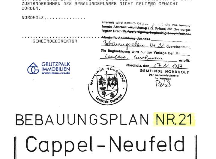 Wer zu spät kommt, den bestraft das Leben! Wann wollen Sie sich dieses wirklich sehenswerte Baugrundstück in Sichtweite zum Nordseedeich ansehen, bevor Ihnen womöglich ein anderer Interessent zuvorkommt? Schauen Sie es sich selbst an oder vereinbaren Sie telefonisch unter 01 70 - 5 10 88 18 einen Besichtigungstermin, nachdem Sie die vielen Informationen gelesen haben und nachdem Sie sich die vielen Fotos und die Zeichnungen angesehen haben, die Ihnen schon jetzt einen umfassenden Eindruck vermitteln. Die Mobilfunknummer ist häufig auch abends und am Wochenende erreichbar. Zusätzlich zum Kaufpreis von € 186.000,- für 930 m² (entspricht nur € 200,- pro m²) zahlen Sie als Käufer nur noch 5,0 % als niedersächsische Grunderwerbsteuer und zusammen ca. 2 % bis 3 % für Notar- und Grundbuchamtsgebühren, aber KEINE Maklerprovision! Erschließung? Ver- und Entsorgungsleitungen liegen in der Straße, aber nicht auf dem Grundstück! Erst bei einer Bebauung zahlen Sie als Käufer bzw. dann als Bauherr die üblichen Hausanschlusskosten und -abgaben, also zum Beispiel ca. € 8.082,- als Kanalbaubeitrag für ein 930 m² großes Grundstück. Als Bauherr zahlen Sie auch die Kosten für Ihre knapp 5 m lange Zuwegung von der Straße zur grundstückseigenen und 20 m langen Zufahrt mit einer Verrohrung des relativ verlandeten Straßengrabens. Hier gilt der Bebauungsplan Nr. 21 der Gemeinde Nordholz vom 22.10.1987 mit seinen wenigen und relativ liberalen Vorgaben. Wegen dieses rechtskräftigen Bebauungsplanes wäre ein Baubeginn relativ kurzfristig möglich, aber: Es handelt sich hierbei um Bauland OHNE Bauzwang, denn es besteht KEINE Bauantragspflicht und KEINE Pflicht zur Baufertigstellung innerhalb bestimmter Fristen. Das Angebot ist freibleibend und unverbindlich. Die hier gemachten Angaben sind unverbindliche Beschreibungen. Sie stellen keine zugesicherten Eigenschaften dar. Wir haften nicht für Irrtümer, Eingabefehler und Datenübermittlungsfehler. Entscheidend sind allein die Vereinbarungen im Kaufvertrag. Dies gilt auch für Flächenangaben und für Maßstäblichkeit und Maßhaltigkeit in den Plänen bzw. Zeichnungen. Ein zwischenzeitlicher Verkauf bleibt vorbehalten. Die Beurkundung eines Kaufvertrages und eine Übernahme des Grundstückes sind auf Wunsch relativ kurzfristig möglich. Wir bitten Sie, uns bei Ihrer Anfrage nicht nur Ihren vollständigen Namen, Ihre Telefonnummer und Ihre E-Mail-Adresse, sondern auch Ihre vollständige BRIEFPOSTANSCHRIFT zu nennen, damit wir Ihnen bei konkretem Interesse noch ausführlichere Unterlagen senden können und damit wir wissen, mit wem wir es als Kunden zu tun haben.