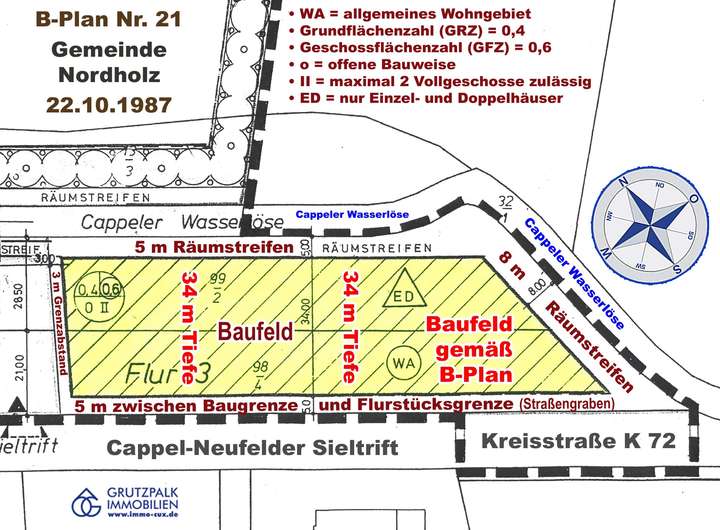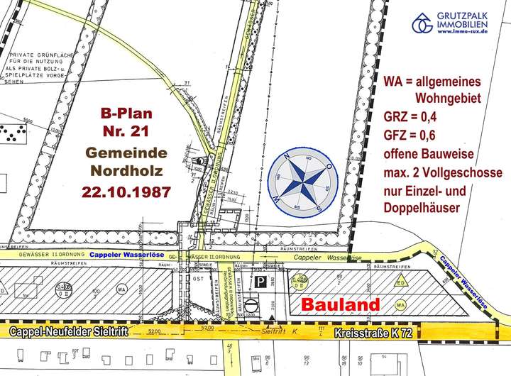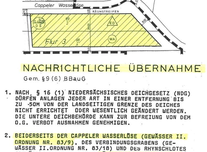 Träumen Sie davon, ein Haus in Form eines Leuchtturms, eines Wasserturms oder einer Windmühle zu bauen, und dann ganz oben mit FernSeeSicht über den Nordseedeich bis zur Insel Neuwerk? Wollen Sie am Wasser wohnen oder Urlaub machen? Mögen Sie eine ländlich-ruhige oder auch idyllisch zu nennende Lage in Sichtweite zum Nordseedeich und mit Weitblick über Wiesen und Felder? Wollen Sie nah am Wasser bauen, OHNE dass man Ihnen vorschreibt, ob und wann Sie mit Ihrem Bau beginnen und wann Sie fertig werden müssen? Zwischen Cuxhaven und Bremerhaven, zwischen Spieka-Neufeld und Dorum-Neufeld, nämlich in Cappel-Neufeld in 27639 Wurster Nordseeküste (Nordholz), zwischen der Cappel-Neufelder Sieltrift und der Cappeler Wasserlöse, steht ein 930 m² großes Baugrundstück direkt an der Cappeler Wasserlöse mit einer ca. 56 m langen Uferlinie provisionsfrei (!) zum Verkauf. Hier gilt seit dem 22.10.1987 der amtliche Bebauungsplan Nr. 21 der Gemeinde Nordholz. Dieser Bebauungsplan lässt sowohl EINZELhäuser als auch DOPPELhäuser zu, also Häuser mit 1 oder 2 Hauseingängen, aber keine Reihenhäuser. Die Zahl der Wohnungen pro Hauseingang ist nicht begrenzt. Zulässig, aber nicht vorgeschrieben sind hier sogar bis zu zwei Vollgeschosse (Etagen) und dann zusätzlich oben drauf auch noch ein Dachgeschoss (vielleicht sogar mit Spitzboden bzw. Dachboden) oder ein Staffelgeschoss, also ohne Dachschrägen, aber dann mit Dachterrasse. Es wäre also auch ein Haus in Form einer STADTVILLA möglich. Und wenn Sie Ihren Neubau mit einem ebenerdigen Sockelgeschoss mit weniger als 220 cm Raumhöhe (zum Beispiel für Garagen und Abstellräume) planen und bauen, dnn könnten Sie ganz oben sogar über den Nordseedeich bis zur Insel Neuwerk schauen. Begrenzungen der First- und Traufhöhe und Vorschriften zur Dachform, zur Dacheindeckung oder zur Fassadengestaltung gibt es hier nicht! Die Kennziffern des Bebauungsplanes lassen hier eine relativ große und hohe Ausnutzung der Grundstücksfläche zu: Die Grundflächenzahl ist mit GRZ = 0,4 und Geschossflächenzahl ist mit GFZ = 0,6 festgesetzt. Der Bereich ist als WA-Gebiet (allgemeines WOHN-Gebiet) ausgewiesen. Ein satzungsgemäßes Verbot der Nutzung als Zweit- bzw. Nebenwohnsitz (also zum Beispiel als familieninternes Urlaubsdomizil) gibt es hier nach unserem Kenntnisstand nicht. Eine Ausnahmegenehmigung (hier: Nutzungsänderungsgenehmigung) für die Vermietung als Ferienhaus bzw. Ferienwohnung an ständig wechselnde Kurzzeitgäste (Urlauber) dürfte im WA-Wohngebiet aber recht unwahrscheinlich sein. Die Kosten der Zuwegung von der Straße über den ca. 4,70 bis 4,80 m breiten Randstreifen (öffentlicher Grünstreifen mit weitgehend verlandetem Straßengraben) auf das Grundstück hat der Bauherr selbst zu tragen. Zum Baugrundstück gehört eine 20 m lange und 3,50 m breite Zufahrt zum eigentlichen Baufeld. Sie wohnen und urlauben also abseits der Straße. Der zuständige Zweckverband fordert beim Anschluss eines Neubaus auf dem 930 m² großen Grundstück an das Schmutzwasserleitungsnetz ca. 8,69 €/m² = ca. € 8.082,- als Kanalbaubeitrag vom Bauherrn. Eine Bauantragspflicht (also: Bauzwang) mit Fristen zum Baubeginn und zur Baufertigstellung gibt es hier nicht. Nach unserem Kenntnisstand können Sie hier gemäß aktueller Rechtslage und Rechtsprechung frei entscheiden, ob und wann Sie bauen wollen oder nicht. Sie können dieses wertvolle Bauland also auch unbebaut als Kapitalanlage nutzen, um Ihr Geld vor einem möglichen Wertverfall durch Inflation wie bei anderen Anlageformen zu schützen. Erinnern Sie sich? Bei den deutschen Währungsreformen von 1923 und 1948 waren die Eigentümer von Sachwerten wie Immobilien klar im Vorteil!