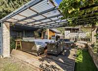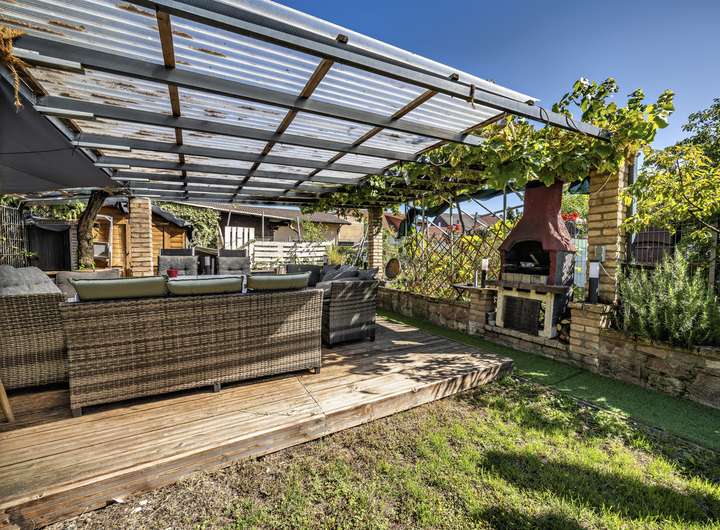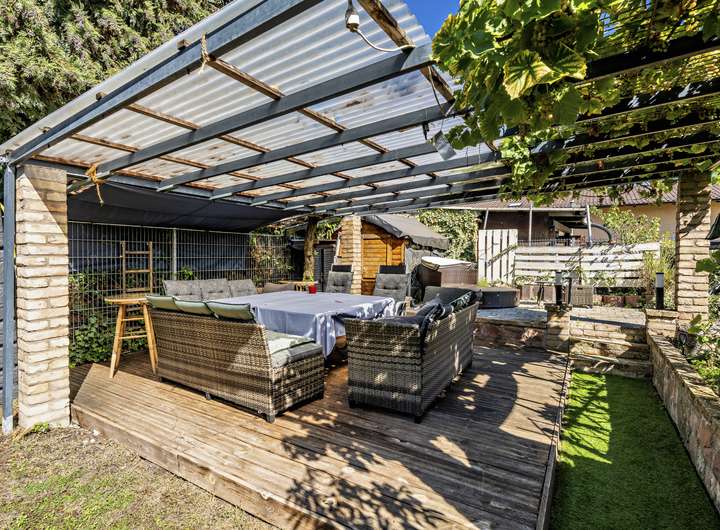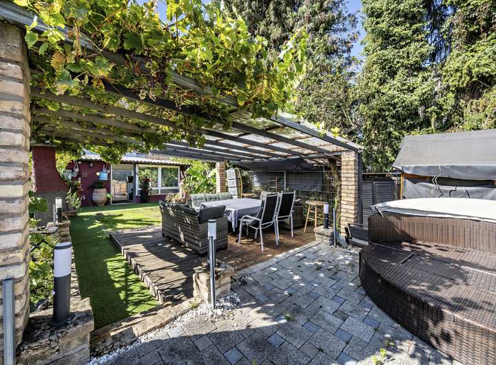 Besonders toll ist der schön angelegte mediterrane Garten mit großzügigen Sitzmöglichkeiten unter der überdachten Terrasse mit ca. 20 m², der eine erholsame Zeit im Freien bietet.