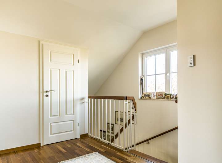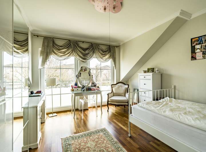 Im Obergeschoss befinden sich die Schlafzimmer, die durch ihre ruhige Lage und den Zugang zu einem Balkon bestechen. Hier können Sie entspannte Stunden genießen und den Blick über die Nachbarschaft schweifen lassen. Ein geschmackvoll gestaltetes Badezimmer rundet das Angebot im Obergeschoss ab.