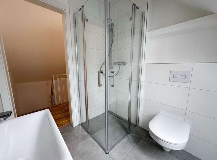 Das Obergeschoss ist als Vollgeschoss ohne Dachschrägen gestaltet und beinhaltet das Schlafzimmer, zwei Kinderzimmer sowie ein erstes Masterbad mit Wanne, Waschmaschinenanschluss und einer hochwertigen Markenausstattung.