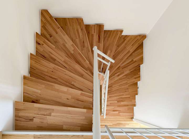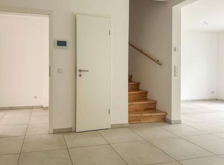 Alle Wohnräume sind mit einer Fußbodenheizung ausgestattet. Im Erdgeschoss sind moderne Fliesen verlegt, während Echtholzparkett in den oberen Geschossen das Raumgefühl aufwertet.