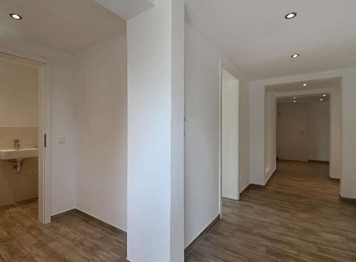 Fliesen in Holzbodenoptik, weiße Kassettentüren, weiße Fenster,