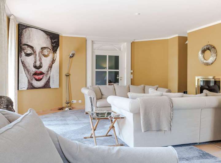 - Lichtdurchfluteter Wohnbereich mit Kamin, offene Küche mit Kochinsel