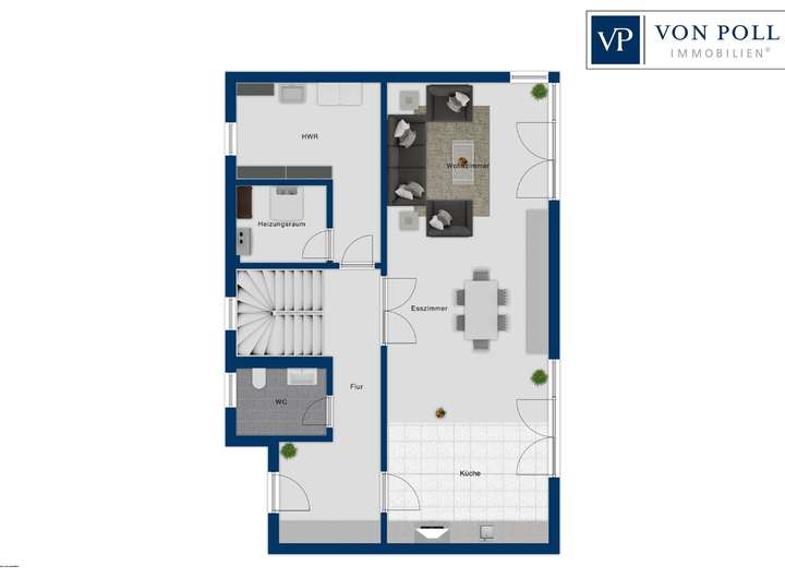 Im Erdgeschoss schaffen überwiegend bodentiefe Fenster eine lichtdurchflutete Atmosphäre. Elektrische Sonnen- und Sichtschutzsysteme bieten Komfort und Privatsphäre. Hier befinden sich der großzügige Wohn- und Essbereich mit Platz für eine Einbauküche, ein Gäste-WC sowie ein Hauswirtschaftsraum mit angrenzendem Technikraum. Eine offene Eichenholztreppe verbindet das Erdgeschoss stilvoll mit dem Obergeschoss.
