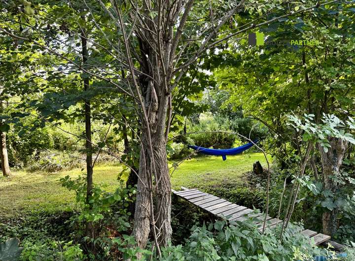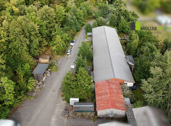 Das rund 5.340 m² große Grundstück liegt am Rande eines Gewerbegebiets in der Nähe des Kraftwerks Weisweiler. Es bietet nicht nur Raum zum Arbeiten und Wohnen, sondern auch eine grüne Oase zur Erholung. Ein idyllischer Bachlauf durchzieht das Grundstück, kleine Brücken verbinden die Ufer, und ein liebevoll angelegter Garten mit Obstbäumen, Terrassen, Sitzecken, Hängematte und Strandkorb lädt zum Verweilen ein.
